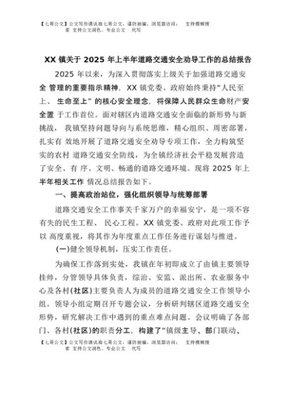 【七哥公文】2025年:XX镇关于2025年上半年道路交通安全劝导工作的总结报告+更多免费公文+VX:QiGeGongWen2024