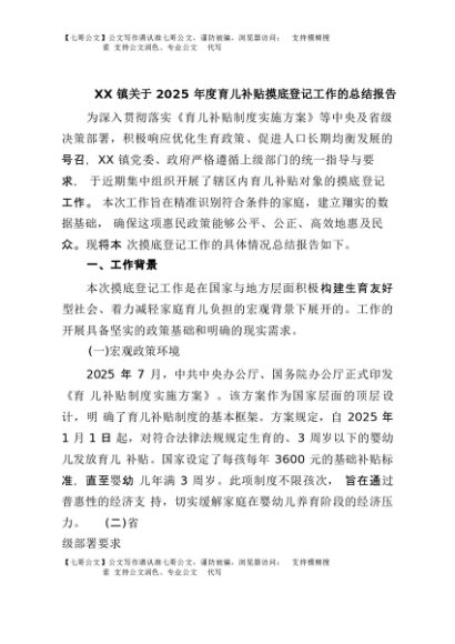 【七哥公文】2025年:XX镇关于2025年度育儿补贴摸底登记工作的总结报告+更多免费公文+VX:QiGeGongWen2024