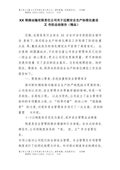 【七哥公文】2025年:XX铁路运输有限责任公司关于近期安全生产标准化建设工作的总结报告(精品)+更多免费公文+VX:QiGeGongWen2024