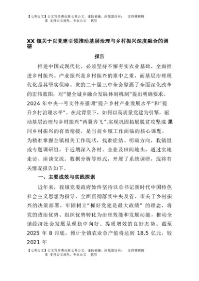 【七哥公文】2025年:XX镇关于以党建引领推动基层治理与乡村振兴深度融合的调研报告+更多免费公文+VX:QiGeGongWen2024