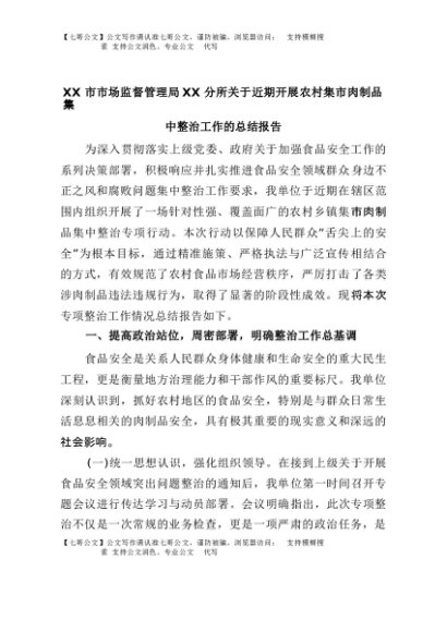 【七哥公文】2025年:XX市市场监督管理局XX分所关于近期开展农村集市肉制品集中整治工作的总结报告+更多免费公文+VX:QiGeGongWen2024