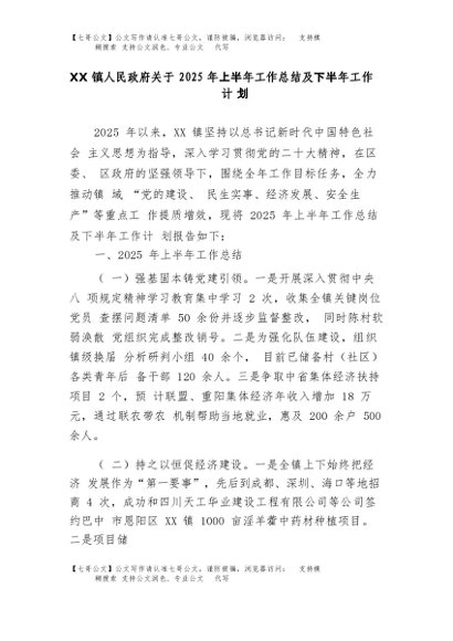 【七哥公文】2025年:XX镇人民政府关于2025年上半年工作总结及下半年工作计划+更多免费公文+VX:QiGeGongWen2024