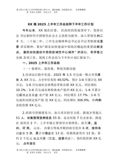 / 【七哥公文】2025年:XX镇2025上半年工作总结和下半年工作计划+更多免费公文+VX:QiGeGongWen2024