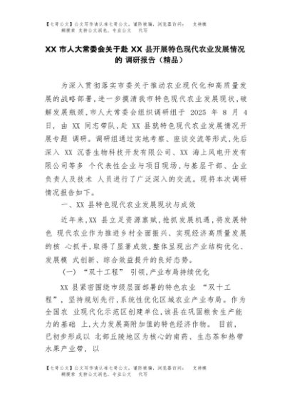 【七哥公文】2025年:XX市人大常委会关于赴XX县开展特色现代农业发展情况的调研报告(精品)+更多免费公文+VX:QiGeGongWen2024