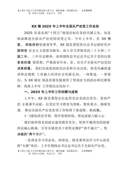 / 【七哥公文】2025年:XX镇2025年上半年全面从严治党工作总结+更多免费公文+VX:QiGeGongWen2024