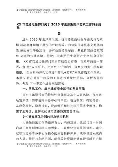 【七哥公文】2025年:XX市交通运输部门关于2025年主汛期防汛防蚊工作的总结报告+更多免费公文+VX:QiGeGongWen2024