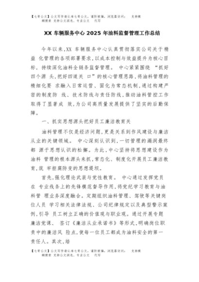 / 【七哥公文】2025年:XX车辆服务中心2025年油料监督管理工作总结+更多免费公文+VX:QiGeGongWen2024