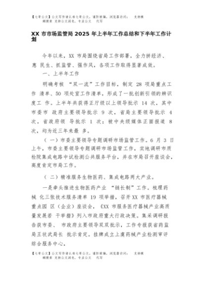 【七哥公文】2025年:XX市市场监管局2025年上半年工作总结和下半年工作计划+更多免费公文+VX:QiGeGongWen2024
