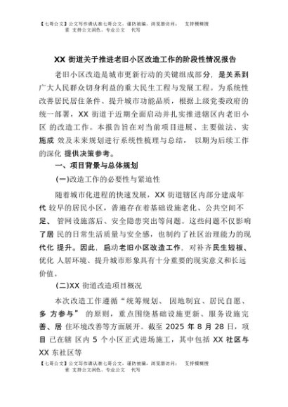 【七哥公文】2025年:XX街道关于推进老旧小区改造工作的阶段性情况报告+更多免费公文+VX:QiGeGongWen2024