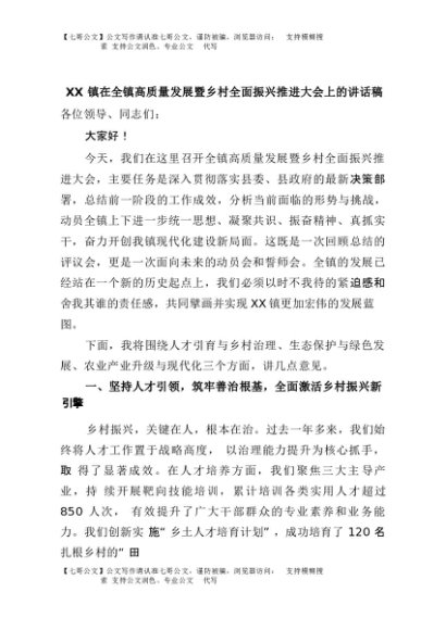 【七哥公文】2025年:XX镇在全镇高质量发展暨乡村全面振兴推进大会上的讲话稿+更多免费公文+VX:QiGeGongWen2024