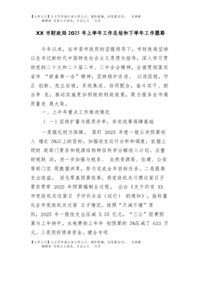 【七哥公文】2025年:XX市财政局2025年上半年工作总结和下半年工作思路+更多免费公文+VX:QiGeGongWen2024