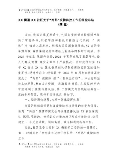 【七哥公文】2025年:XX街道XX社区关于“两热”疫情防控工作的经验总结(精品)+更多免费公文+VX:QiGeGongWen2024