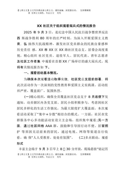 / 【七哥公文】2025年:XX社区关于组织观看阅兵式的情况报告+更多免费公文+VX:QiGeGongWen2024