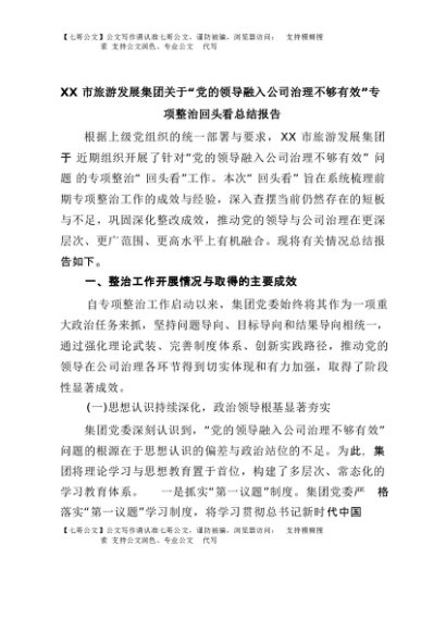 【七哥公文】2025年:XX市旅游发展集团关于“党的领导融入公司治理不够有效”专项整治回头看总结报告+更多免费公文+VX:QiGeGongWen2024