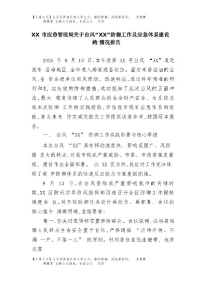 【七哥公文】2025年:XX市应急管理局关于台风“XX”防御工作及应急体系建设的情况报告+更多免费公文+VX:QiGeGongWen2024