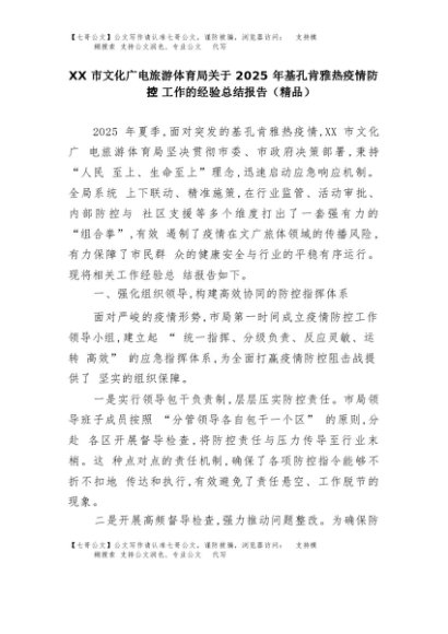 【七哥公文】2025年:XX市文化广电旅游体育局关于2025年基孔肯雅热疫情防控工作的经验总结报告(精品)+更多免费公文+VX:QiGeGongWen2024