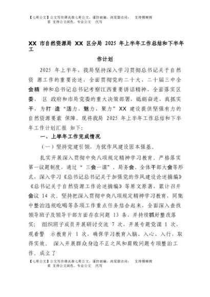 【七哥公文】2025年:XX市自然资源局XX区分局2025年上半年工作总结和下半年工作计划+更多免费公文+VX:QiGeGongWen2024