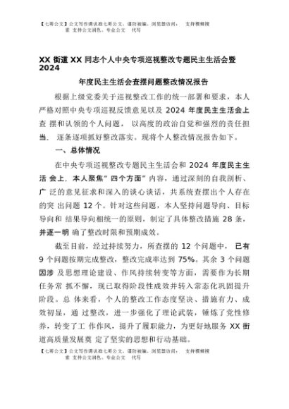 【七哥公文】2025年:XX街道XX同志个人中央专项巡视整改专题民主生活会暨2024年度民主生活会查摆问题整改情况报告+更多免费公文+VX:QiGeGongWen2024