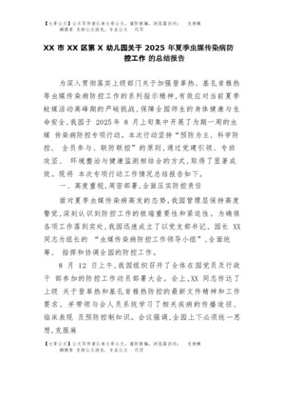 【七哥公文】2025年:XX市XX区第X幼儿园关于2025年夏季虫媒传染病防控工作的总结报告+更多免费公文+VX:QiGeGongWen2024