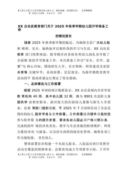 【七哥公文】2025年:XX自治县教育部门关于2025年秋季学期幼儿园开学准备工作的情况报告+更多免费公文+VX:QiGeGongWen2024