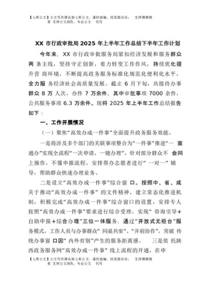 【七哥公文】2025年:XX市行政审批局2025年上半年工作总结下半年工作计划+更多免费公文+VX:QiGeGongWen2024
