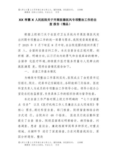 【七哥公文】2025年:XX市第X人民医院关于开展医德医风专项整治工作的自查报告(精品)+更多免费公文+VX:QiGeGongWen2024