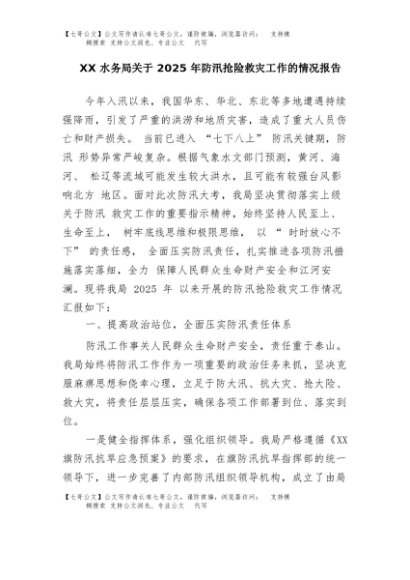 【七哥公文】2025年:XX水务局关于2025年防汛抢险救灾工作的情况报告+更多免费公文+VX:QiGeGongWen2024