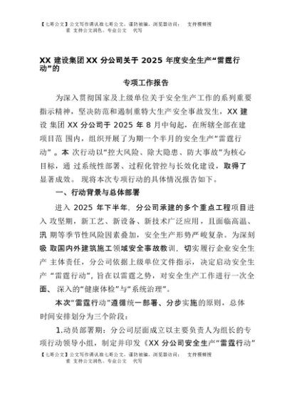 【七哥公文】2025年:XX建设集团XX分公司关于2025年度安全生产“雷霆行动”的专项工作报告+更多免费公文+VX:QiGeGongWen2024