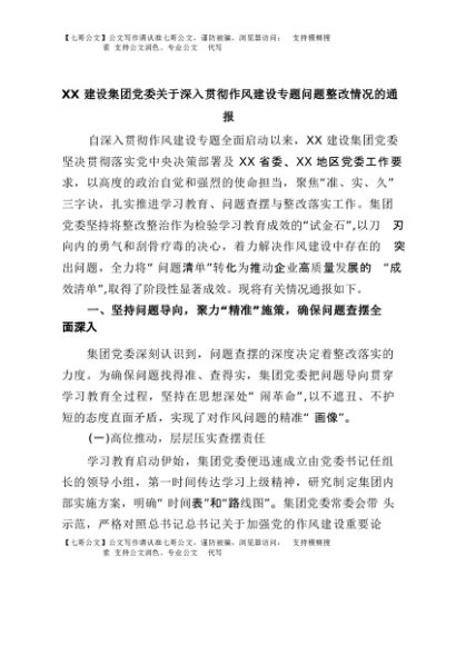 【七哥公文】2025年:XX建设集团党委关于深入贯彻作风建设专题问题整改情况的通报+更多免费公文+VX:QiGeGongWen2024