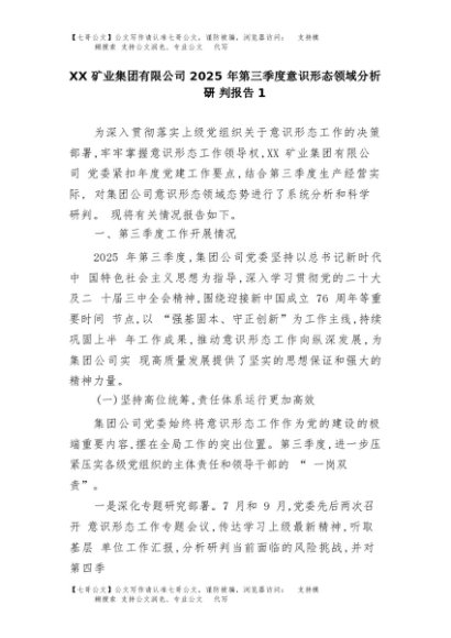 【七哥公文】2025年:XX矿业集团有限公司2025年第三季度意识形态领域分析研判报告1+更多免费公文+VX:QiGeGongWen2024