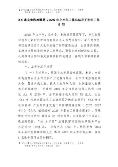 【七哥公文】2025年:XX市文化和旅游局2025年上半年工作总结及下半年工作计划+更多免费公文+VX:QiGeGongWen2024