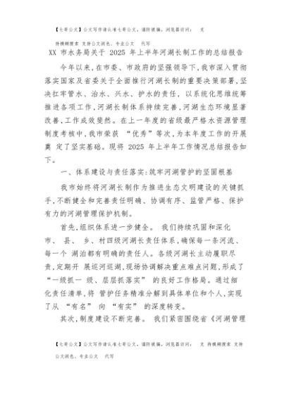 【七哥公文】2025年:XX市水务局关于2025年上半年河湖长制工作的总结报告+更多免费公文+VX:QiGeGongWen2024