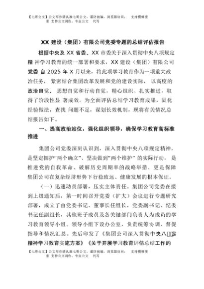 / 【七哥公文】2025年:XX建设(集团)有限公司党委专题的总结评估报告+更多免费公文+VX:QiGeGongWen2024