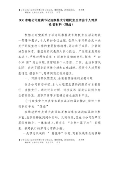 【七哥公文】2025年:XX水电公司党委书记巡察整改专题民主生活会个人对照检查材料(精品)+更多免费公文+VX:QiGeGongWen2024