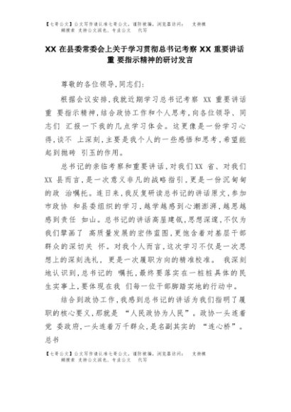【七哥公文】2025年:XX在县委常委会上关于学习贯彻总书记考察XX重要讲话重要指示精神的研讨发言+更多免费公文+VX:QiGeGongWen2024
