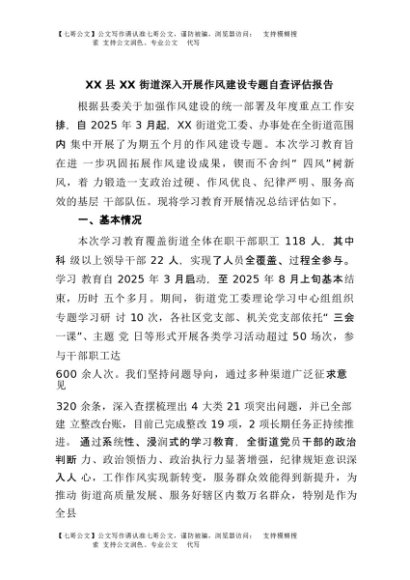 / 【七哥公文】2025年:XX县XX街道深入开展作风建设专题自查评估报告+更多免费公文+VX:QiGeGongWen2024