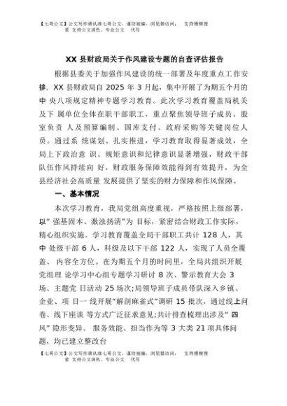 / 【七哥公文】2025年:XX县财政局关于作风建设专题的自查评估报告+更多免费公文+VX:QiGeGongWen2024