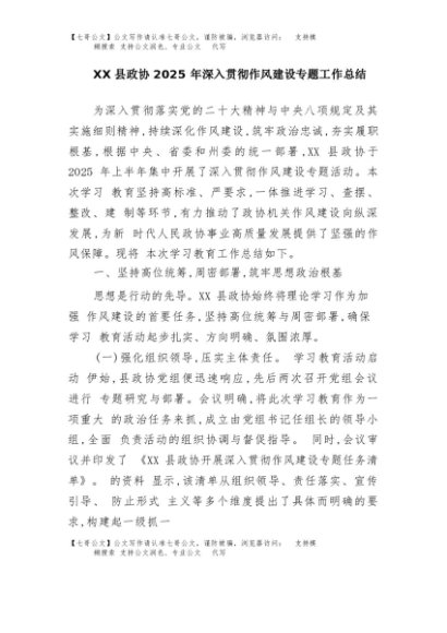 【七哥公文】2025年:XX县政协2025年深入贯彻作风建设专题工作总结+更多免费公文+VX:QiGeGongWen2024