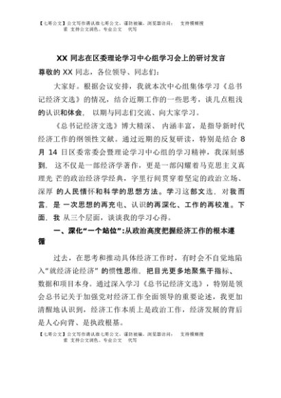 / 【七哥公文】2025年:XX同志在区委理论学习中心组学习会上的研讨发言+更多免费公文+VX:QiGeGongWen2024