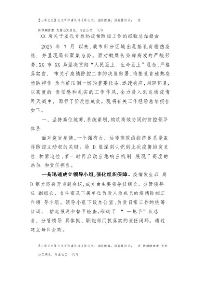 / 【七哥公文】2025年:XX局关于基孔肯雅热疫情防控工作的经验总结报告+更多免费公文+VX:QiGeGongWen2024