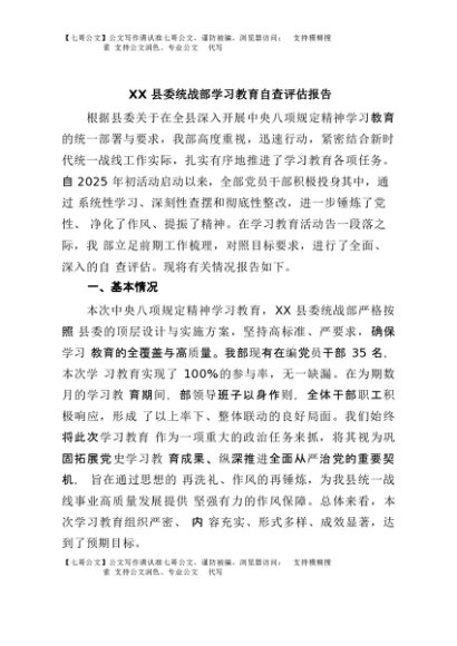 / 【七哥公文】2025年:XX县委统战部学习教育自查评估报告+更多免费公文+VX:QiGeGongWen2024