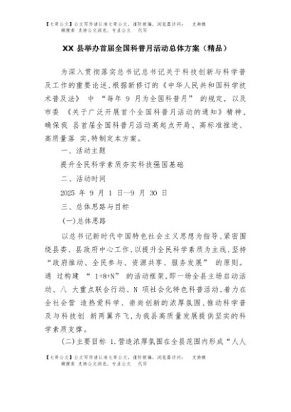 / 【七哥公文】2025年:XX县举办首届全国科普月活动总体方案(精品)+更多免费公文+VX:QiGeGongWen2024
