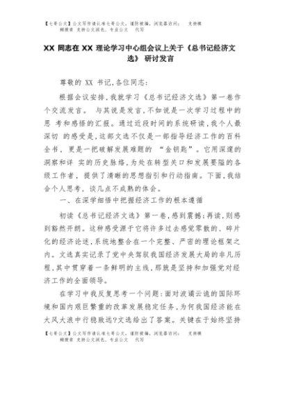 【七哥公文】2025年:XX同志在XX理论学习中心组会议上关于《总书记经济文选》研讨发言+更多免费公文+VX:QiGeGongWen2024