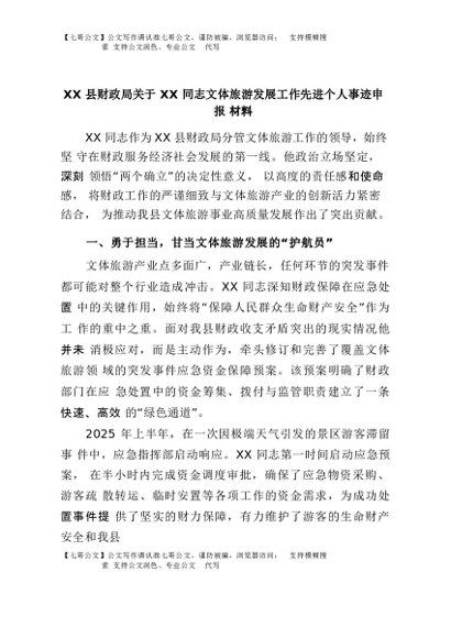 【七哥公文】2025年:XX县财政局关于XX同志文体旅游发展工作先进个人事迹申报材料+更多免费公文+VX:QiGeGongWen2024
