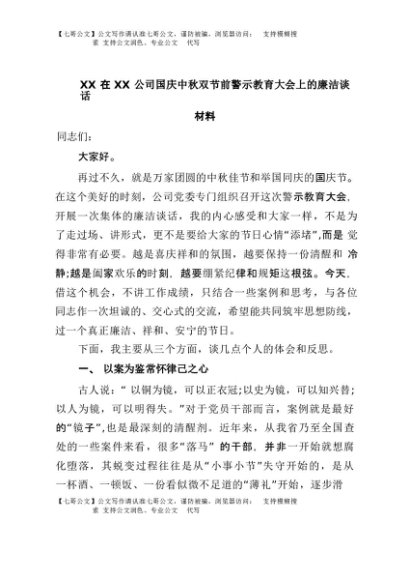 【七哥公文】2025年:XX在XX公司国庆中秋双节前警示教育大会上的廉洁谈话材料+更多免费公文+VX:QiGeGongWen2024