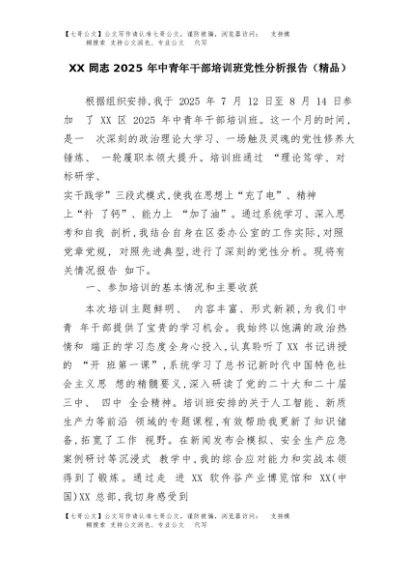 【七哥公文】2025年:XX同志2025年中青年干部培训班党性分析报告(精品)+更多免费公文+VX:QiGeGongWen2024