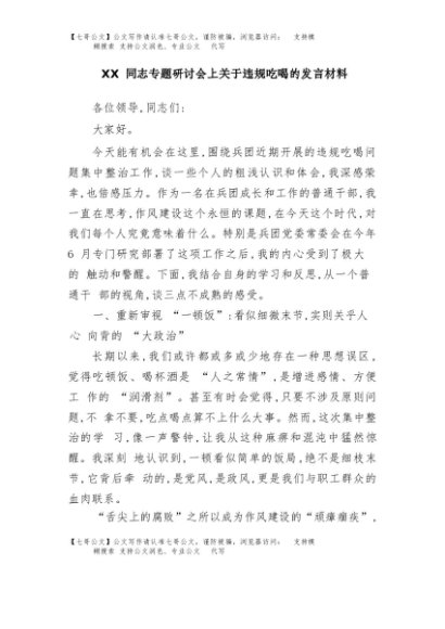 / 【七哥公文】2025年:XX同志专题研讨会上关于违规吃喝的发言材料+更多免费公文+VX:QiGeGongWen2024