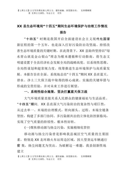 【七哥公文】2025年:XX县生态环境局“十四五”期间生态环境保护与治理工作情况报告+更多免费公文+VX:QiGeGongWen2024