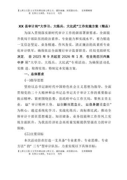 【七哥公文】2025年:XX县审计局“大学习、大练兵、大比武”工作实施方案(精品)+更多免费公文+VX:QiGeGongWen2024