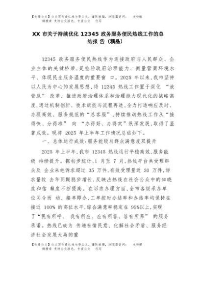 【七哥公文】2025年:XX市关于持续优化12345政务服务便民热线工作的总结报告(精品)+更多免费公文+VX:QiGeGongWen2024